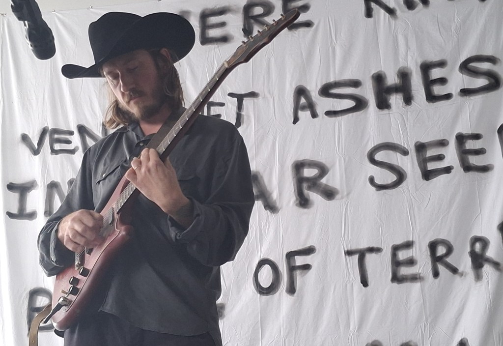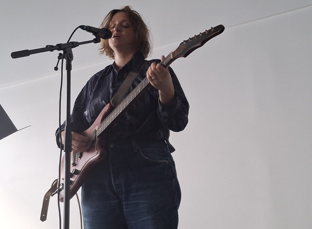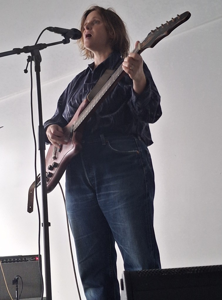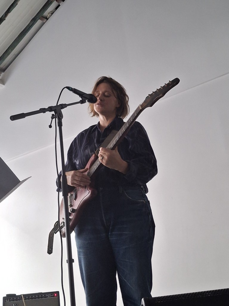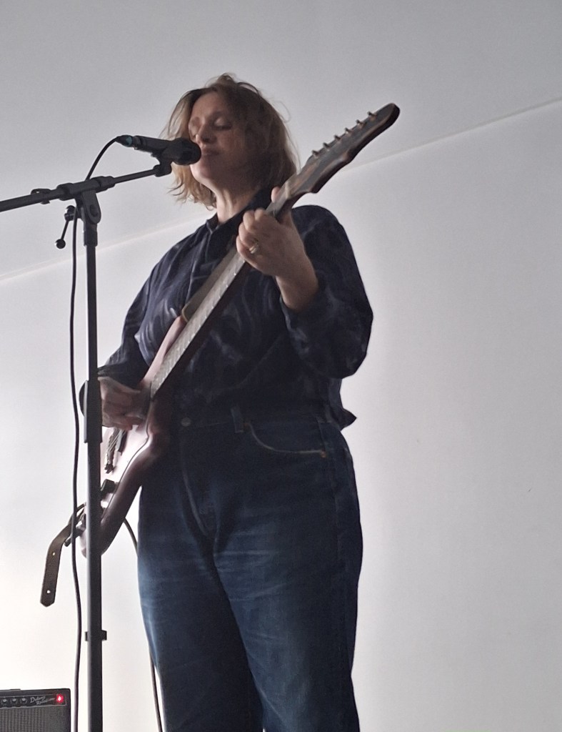 Puis Joanne Robertson. On quitte le terrain de l’ironie pour entrer dans le feutré. Ceux qui ont écouté Blurrr, son album avec Dean Blunt, savent déjà : une voix qui chuchote plus qu’elle ne chante, des guitares effilochées, une intensité qui naît du silence. Sur scène, l’intime devient collectif. Chaque note, chaque souffle, semble flotter dans l’air de la cour, et tout le monde retient un peu son souffle.