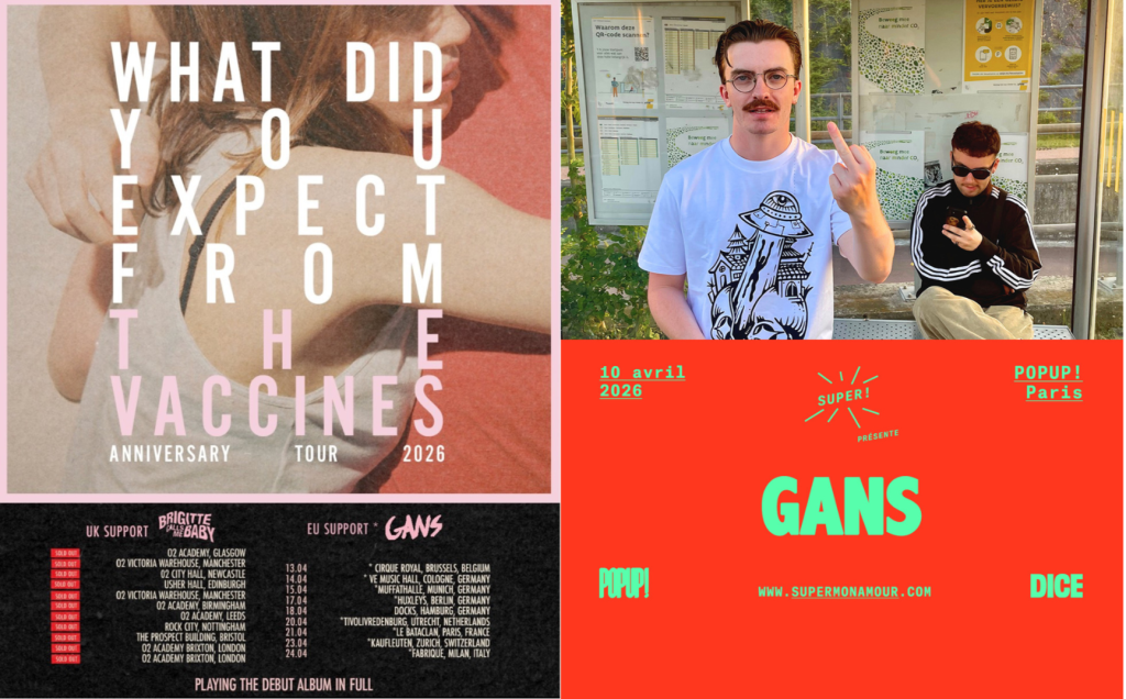 À l’occasion de la sortie de leur nouvel album, le duo GANS investira la scène du POPUP! du Label à Paris le 10 avril. La formation poursuivra ensuite sa tournée européenne, avec notamment une étape le 21 avril au Bataclan, où elle assurera la première partie du groupe britannique The Vaccines.